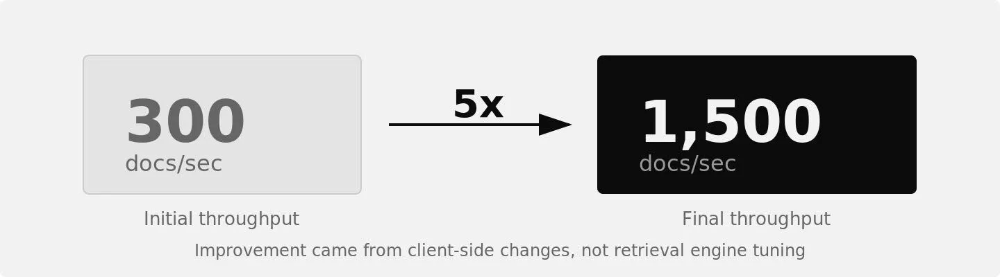That 5x feed throughput improvement came almost entirely from client-side changes, not from tuning the retrieval engine. At scale, the feeding client can easily become a bottleneck, and it tends to get less attention than the retrieval layer.