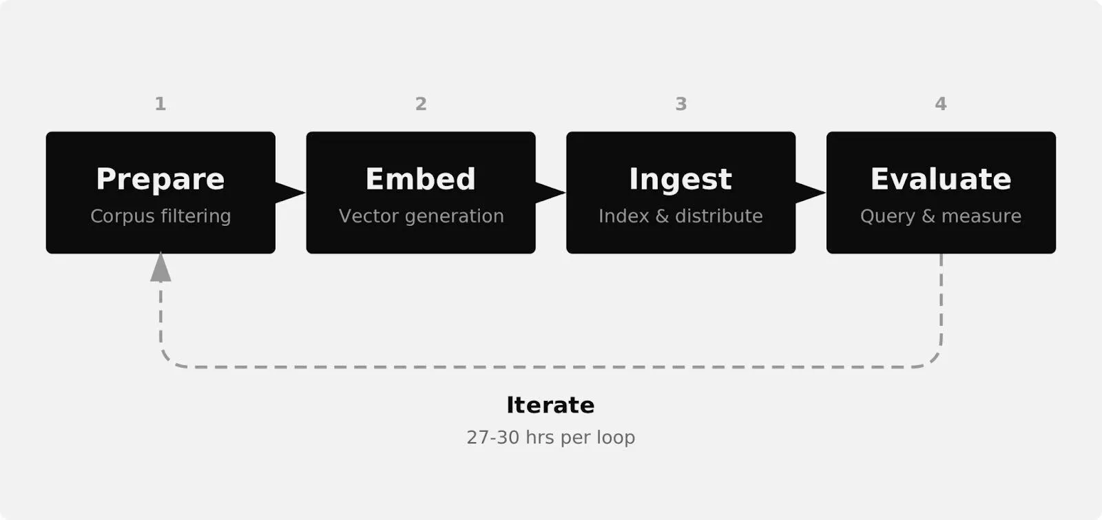 Every configuration choice had a feedback cycle. Change an ANN index parameter? Reindex the full corpus. Want to compare embedding representations? Reindex again. Discover that your preprocessing pipeline lets through too much noise? Start over. At 100 million documents, "start over" is not a casual decision. It is a 27-to-30-hour commitment with no checkpointing.