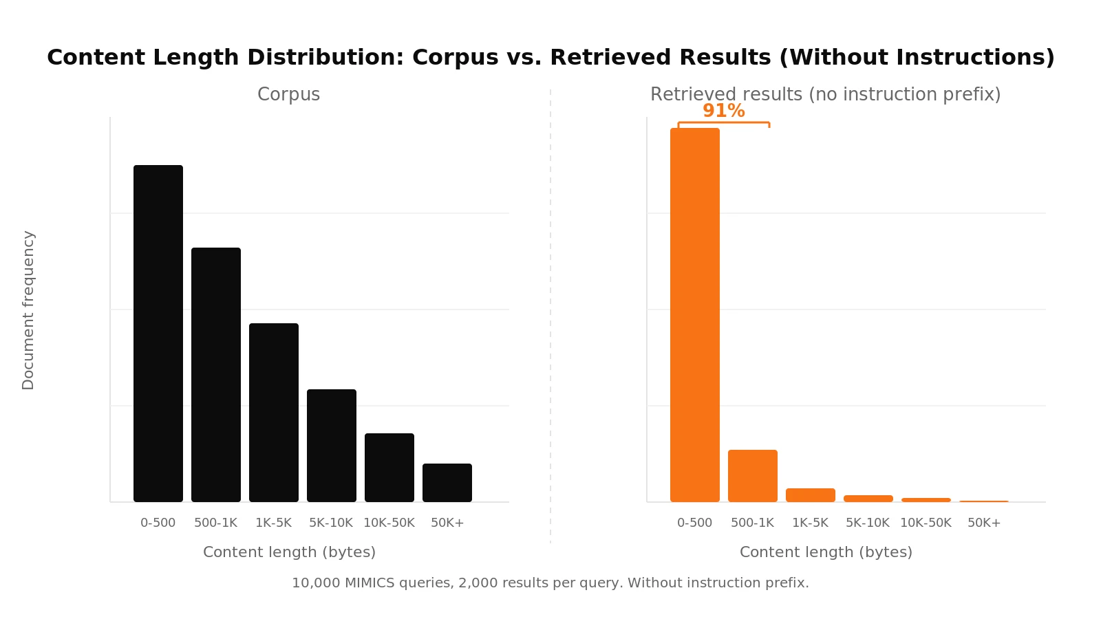 With the instruction prefix, the content length distribution of retrieved documents closely matched the corpus.