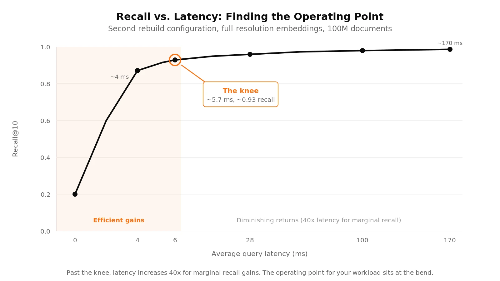 Beyond that, the curve steepened. At a search depth of 128,000, latency reached about 28 ms. At 1,024,000, roughly 170 ms per query. From the cheapest to the most expensive operating point, that is a 40x increase in latency, with most of the recall already captured in the lower range.