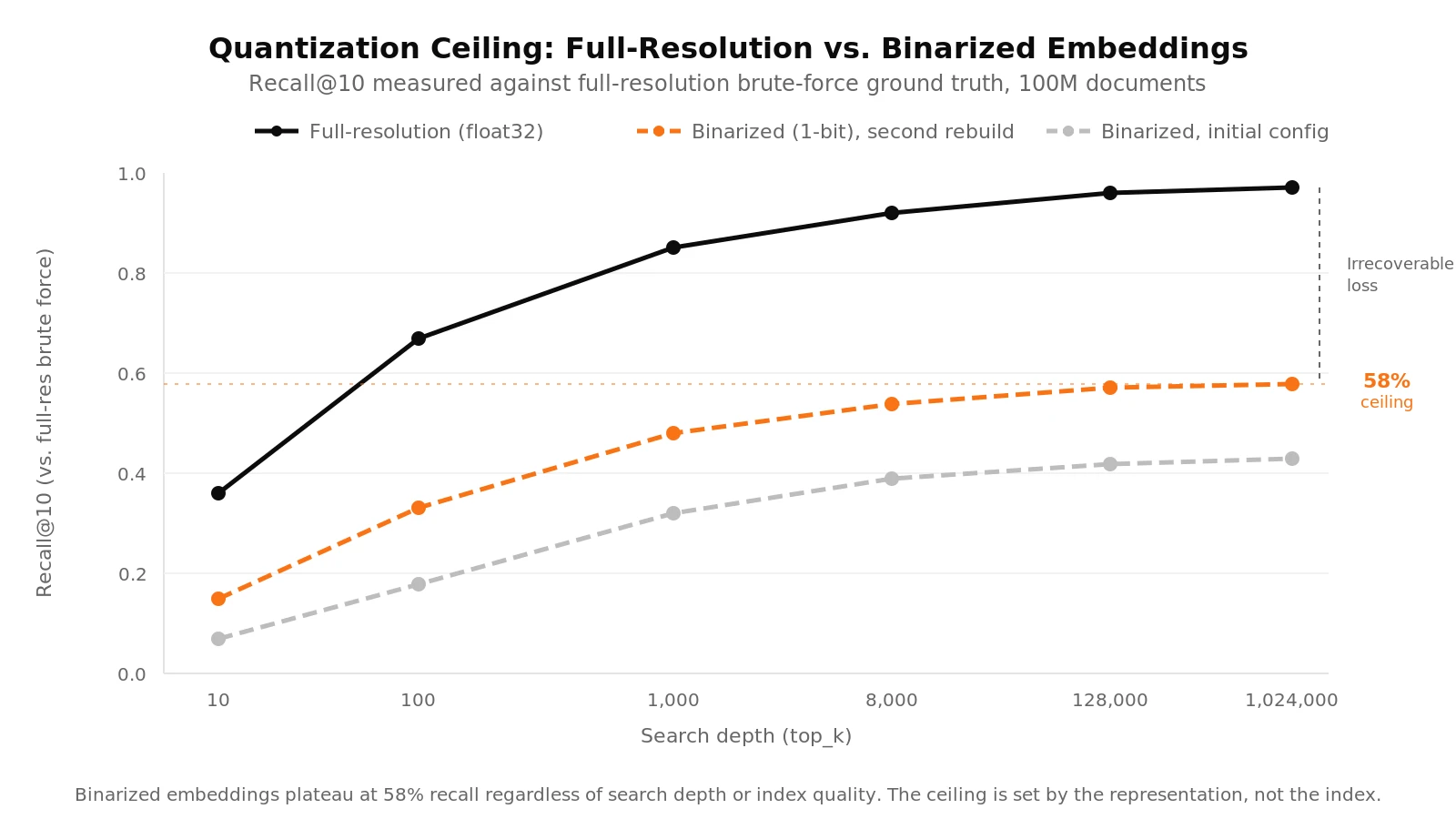 The result was stark. Comparing brute-force results between full-resolution and binarized embeddings revealed that the binarized version could recover at most 58% of the full-resolution top-10 neighbors. That is a hard ceiling. No amount of index tuning, no increase in search depth, can push past what the representation discards.