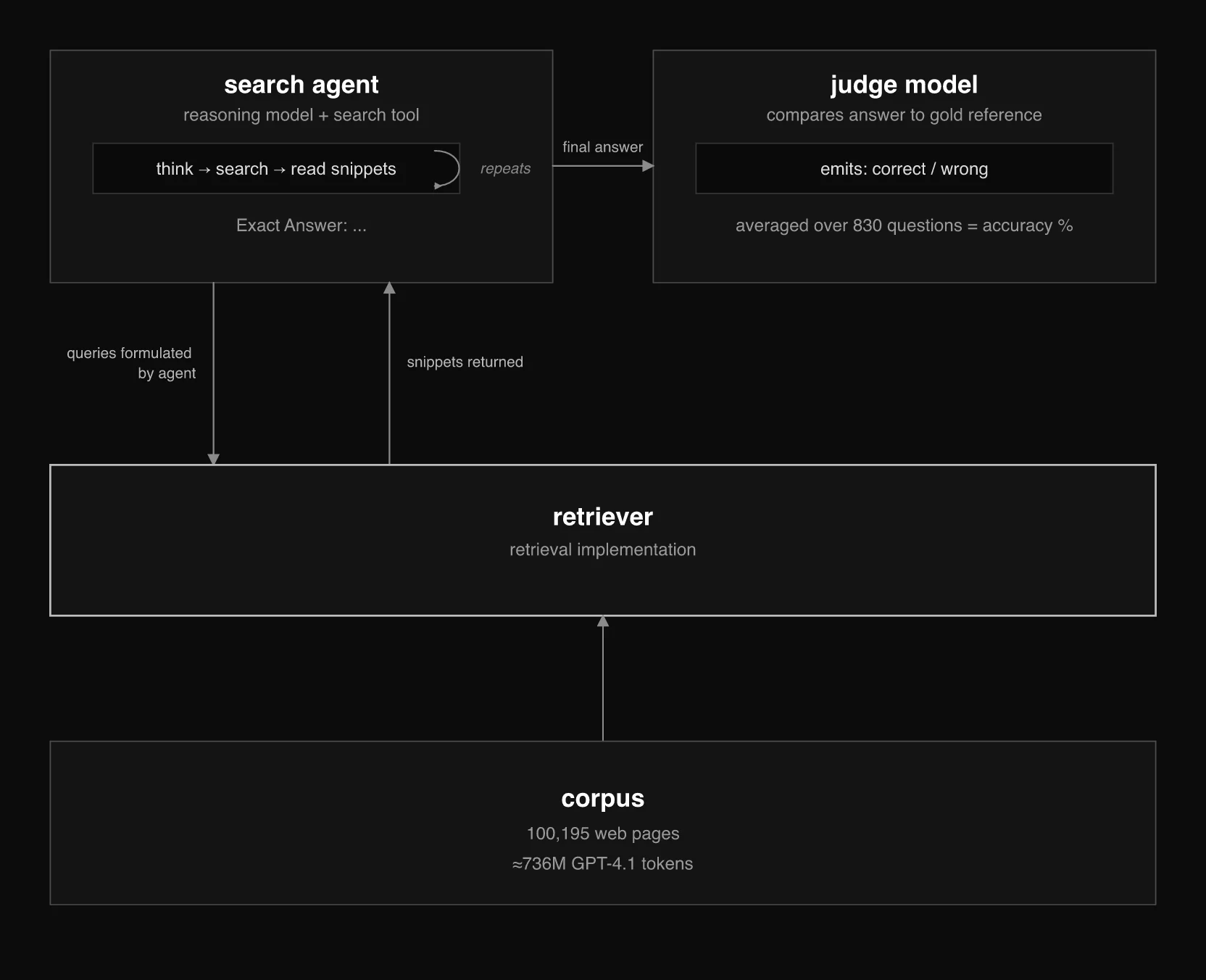 The combination of long multi-hop questions, large, noisy corpus, and truncated snippets makes this one of the most demanding benchmarks for search-augmented reasoning. The fixed corpus and question set also make it an excellent testbed: you can swap retrievers, tune parameters, and change agent behavior while getting a much clearer view of what moved and why.