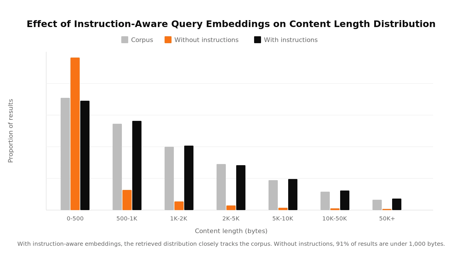 With the instruction prefix, the content length distribution of retrieved documents closely matched the corpus.