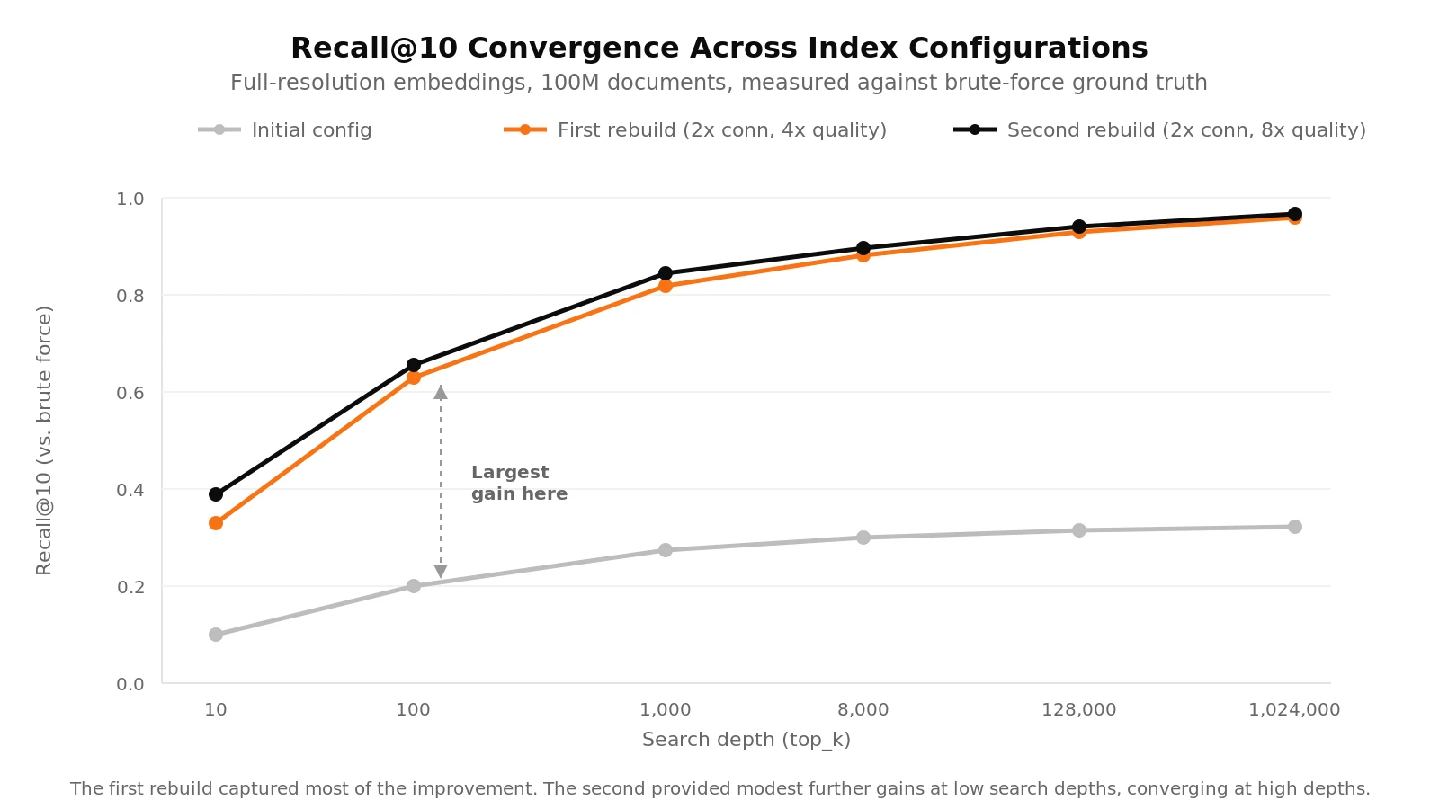 Second reindex: We doubled the resolution while keeping connectivity the same. The improvement was real but modest. At a search depth of 10, recall improved by about 6% over the first reindex. At a search depth of 100, about 2.5%.